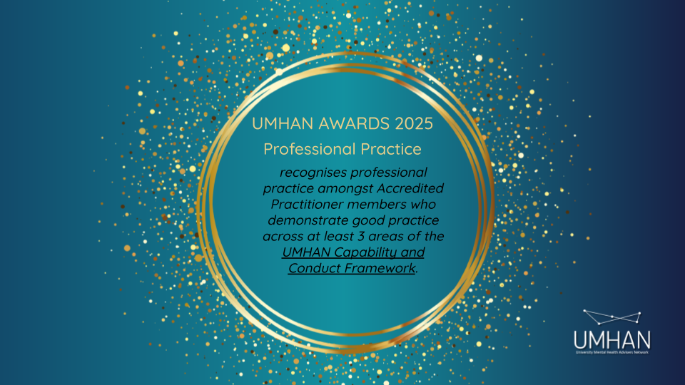 This award recognises professional practice amongst Accredited Practitioner members who demonstrate good practice across at least three areas of the UMHAN Capability and Conduct Framework.
